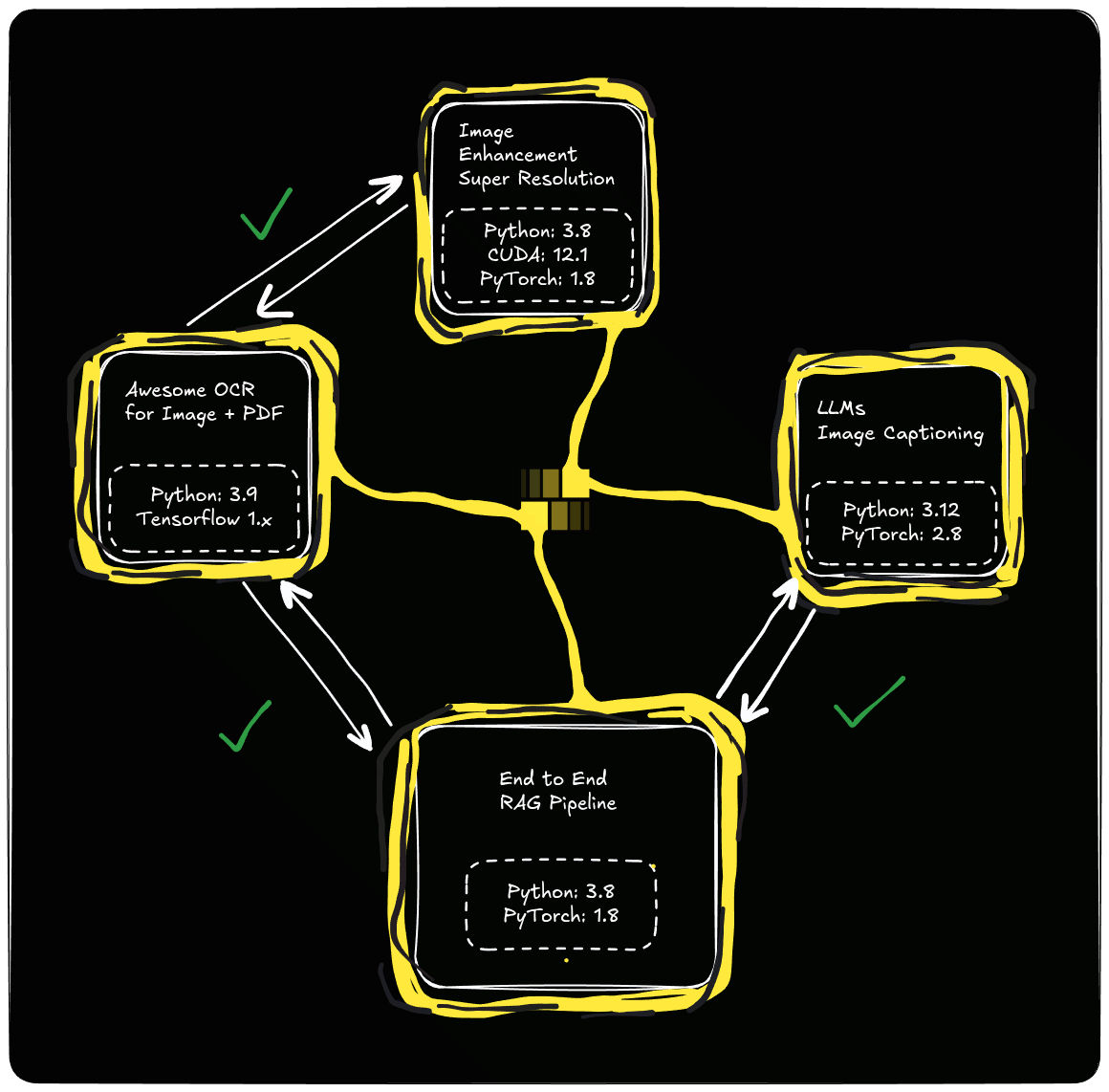 - Encapsulate each conflicting module within a self-contained, isolated runtime leveraging containerization to ensure zero conflicts for python or for any system dependency like cuda.