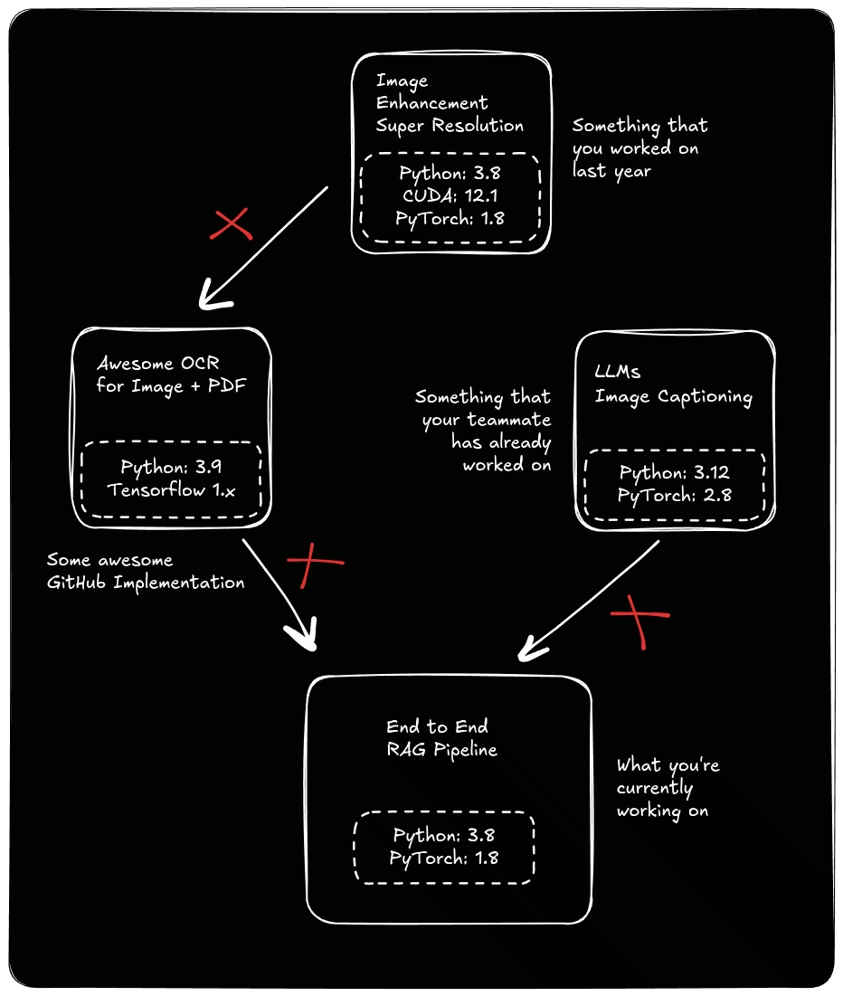 - Instead of making actual progress, you spend hours - if not days - fixing environments, dependencies and import errors or even rewriting perfectly good code just to make it fit.